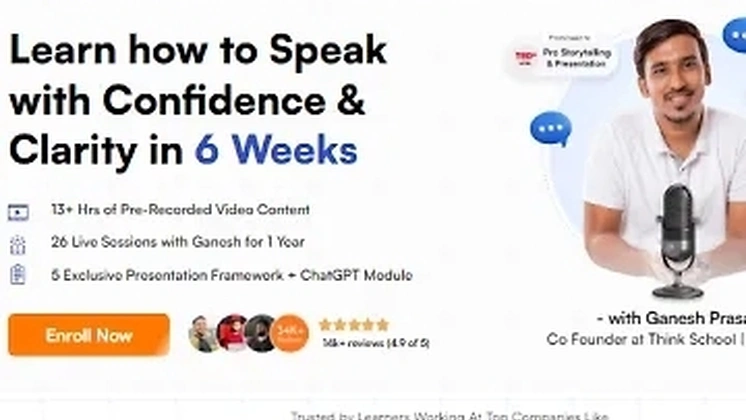 This course will help you express your thoughts confidently and clearly in 6 weeks. It includes over 13 hours of pre-recorded video lectures, 26 live sessions with Ganesh throughout the year, and 5 exclusive presentation frameworks with a ChatGPT module. The course covers fundamental and advanced communication techniques, including structured messaging, body language, analysis of renowned speakers, and presentation skills. It is suitable for working professionals, business owners, and students.